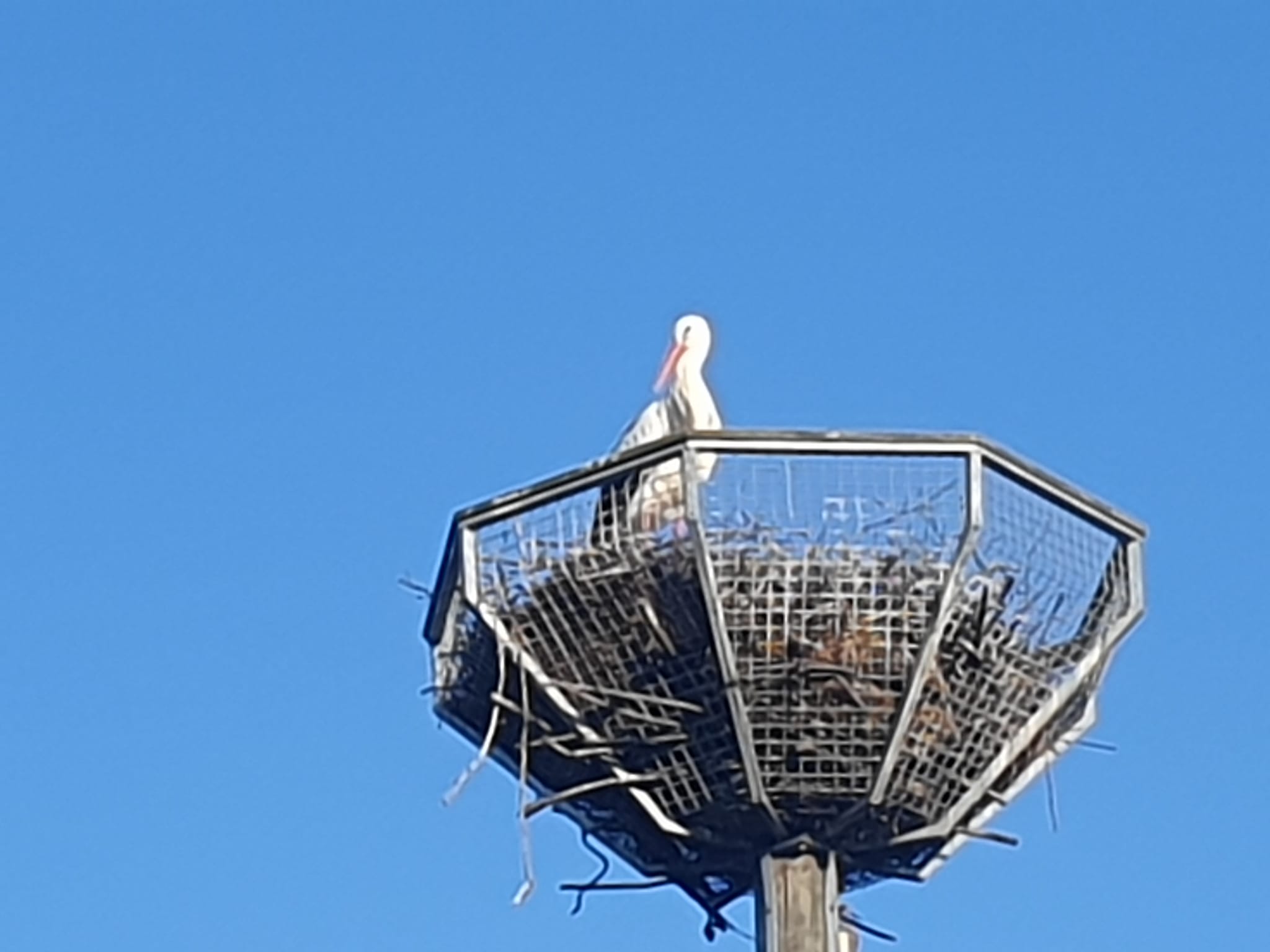 Die Störche basteln an ihrem Korb wie die Weltmeister und schleppen jede Menge Nistmaterial heran. Das wird Nachwuchs geben.